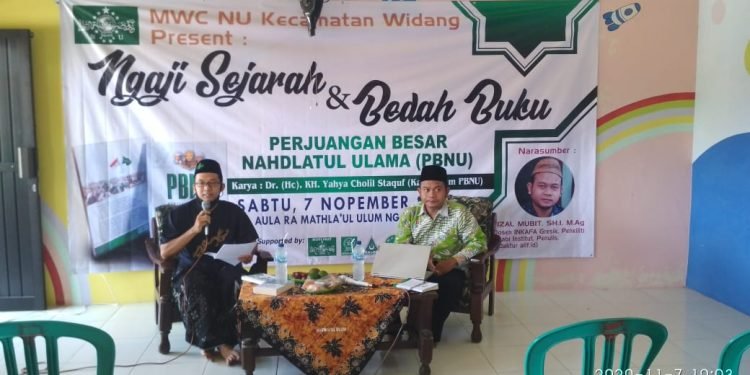 TUBAN – Dalam rangka memperingati Hari Santri Nasional 2020 dan menyambut Hari Pahlawan, MWC NU Kecamatan Widang Kabupaten Tuban melaksanakan kegiatan ngaji sejarah dan bedah buku (Sabtu, 7/11/2020). Buku yang dibedah berjudul “Perjuangan Besar Nahdlatul Ulama (PBNU)” karya Katib ‘Aam PBNU KH. Yahya Cholil Staquf.