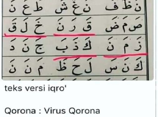 Beberapa hari ini dari beberapa grup whatsapp yang saya ikuti selalu muncul tulisan berbahasa Arab “Qorona-Khalaqa-Zamana-kadzaba” yang teks tersebut berasal dari buku pembelajaran mengaji dengan metode “Iqra'” yang dirajut oleh KH. As’ad Humam.