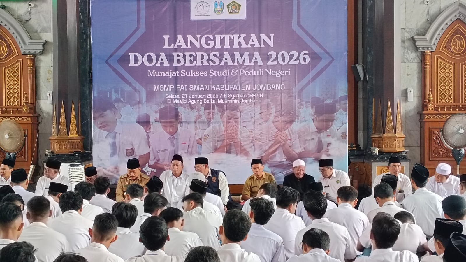 JOMBANG – Sedikitnya 3.000 siswa kelas akhir SMAN Se-Jombang hadir Masjid Agung Baitul Mukminin Jombang, Selasa (27/1). Mereka menghadiri doa bersama yang digelar Musyawarah Guru Mata Pelajaran Pendidikan Agama Islam (MGMP PAl) SMAN Jombang.
