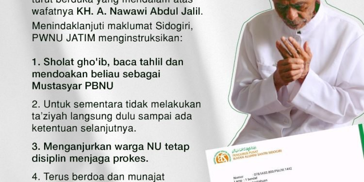 Kini KH Ahmad Nawawi Abdul Jalil telah tiada. Bukan hanya santri dan alumni Ponpes Sidogiri yang khawatir, namun semua kaum muslim di dunia merasakan duka yang mendalam. Sugeng tindak kiai. Alfatehah. (*)