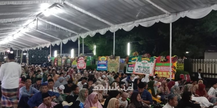 Setibanya di lokasi acara, kami sengaja menuju gerbang tempat masuk lokasi panggung utama. Berdiri sambil mengawasi tempat strategis untuk kami duduk. Melihat gerbang menuju panggung, tentu kami yang bukan siapa-siapa tak diperkenankan masuk ke dalam. Apalagi di luar gerbang sudah disediakan beberapa videotron besar, sound dan tenda untuk menyimak dan menyaksikan berlangsungnya rangkaian puncak Harlah. Ribuan jamaah dan santri mukim duduk bersila rapi di bawah tenda. Tepatnya di tengah – tengah jalan alternatif yang menghubungkan ke arah Kediri Kota. Jalan sudah dialihkan agar tidak melewati lokasi Harlah.