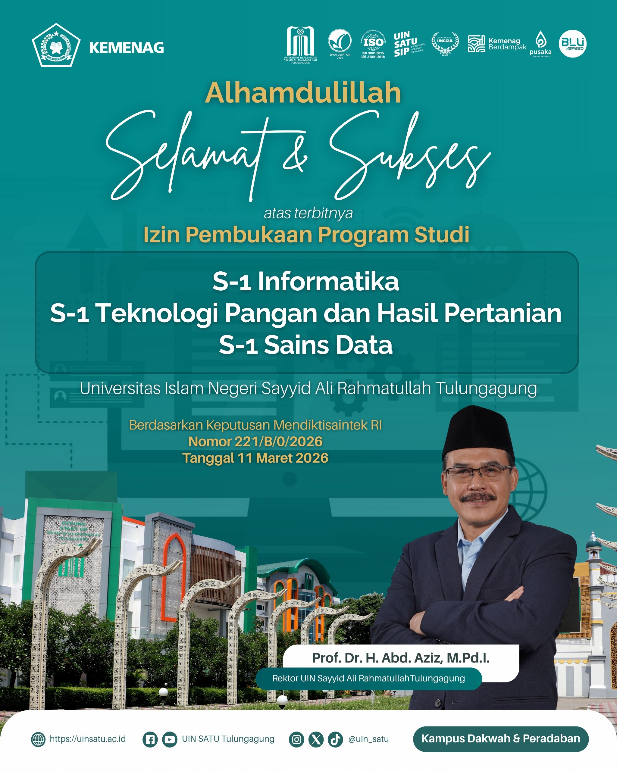 Tulungagung — Universitas Islam Negeri Sayyid Ali Rahmatullah Tulungagung (UIN SATU Tulungagung) kembali memperluas pengembangan akademiknya dengan membuka tiga program studi baru jenjang Sarjana (S1). Ketiga program studi tersebut meliputi Informatika, Teknologi Pangan dan Hasil Pertanian, serta Sains Data.